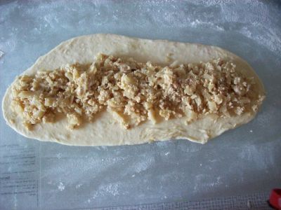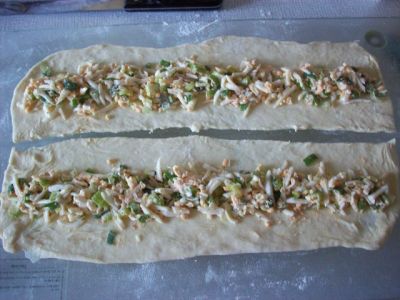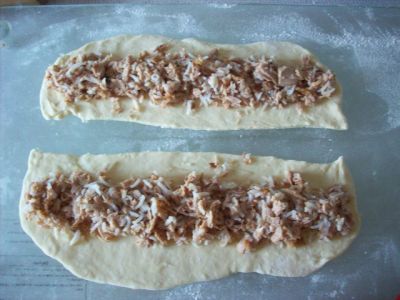 Третий кусок теста сделаем еще чуть-чуть меньше и даже разрезать его не будем. Выложим всю начинку №1 и сделаем одну колбаску.