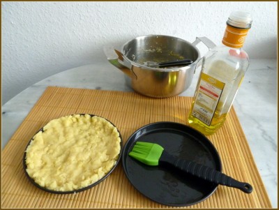 Сверху выкладываем слоями всё, что мы приготовили для начинки, солим и поливаем небольшим количеством оливкового масла. Можно посыпать травками по своему вкусу.