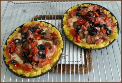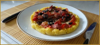 Выкладываем тёплую кукурузную кашу на листик и распределяем её равномерным пластом толщиной около 2 см (я делала в порционных формочках диаметром 17 см). Форму нужно слегка смазать растительным маслом или застелить её бумагой для выпечки.