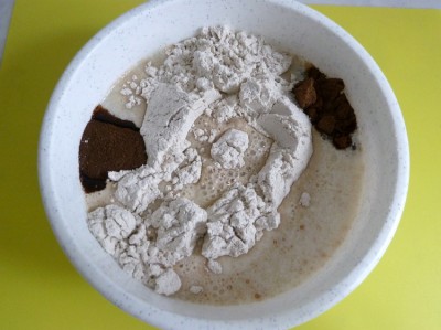 В другой посуде смешиваем холодный кефир и горячую воду (если часть воды использована на разведение свежих дрожжей, то добавляем только остаток 100 гр). Кефир при этом норовит свернуться, но мы размешаем смесь и он успокоится