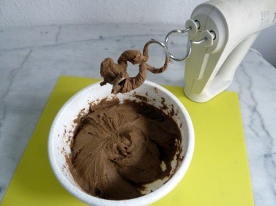Электрическим миксером замешиваем тесто. Оно очень липкое и месить руками его не получится. Месим минут 10, пока тесто не начнёт легко отходить от стенок посуды.