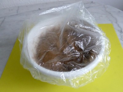 Накрываем миску с тестом полиэтиленовой плёнкой