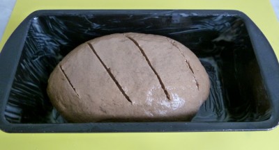 После этого недолго месим тесто и формируем продолговатую буханочку. Выкладываем её в форму, смазываем поверхность водой или пивом и острым лезвием делаем несколько надрезов