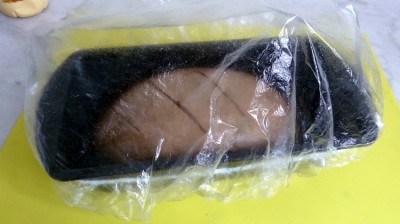 Накрываем форму плёнкой и ставим на расстойку в духовку с включённой лампочкой.