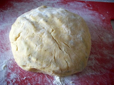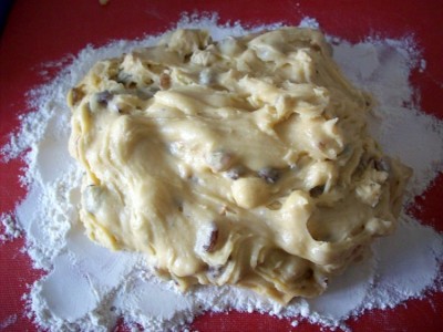 Выкладываем его ложкой на подсыпанную мукой досточку.