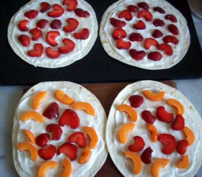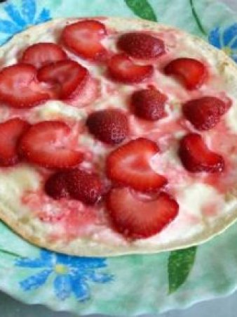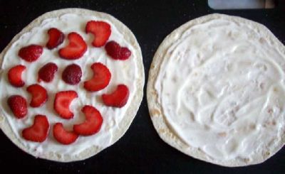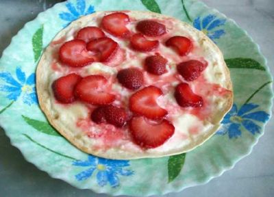 Смазываем лепёшки сметаной, посыпаем немного сахаром и раскладываем нарезанную клубнику.