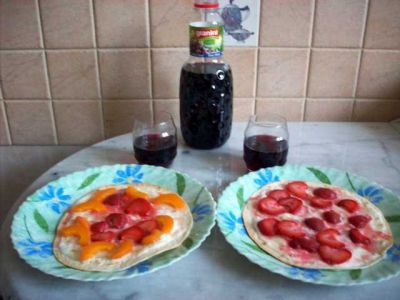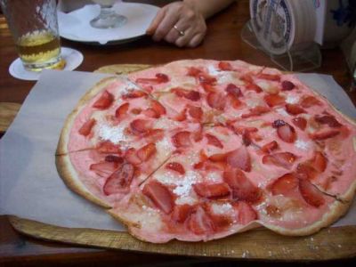 Выбирая закуску к яблочному вину во Франкфурте на Майне, я обнаружила блюдо под названием "Тарт фламбе с клубникой" (Flammkuchen mit Erdbeeren). Интересное блюдо! Я считала, что этот тарт бывает только с луком, ветчиной и т. п.... Разумеется, я его заказала. Так вкусно оказалось!