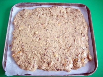 Тесто готово. Выкладываем его тонким слоем (1-2 см) на листик (не забываем подстелить бумагу для выпечки).