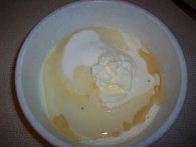 Смешиваем в миске творог, молоко, раст масло, соль, сахар.