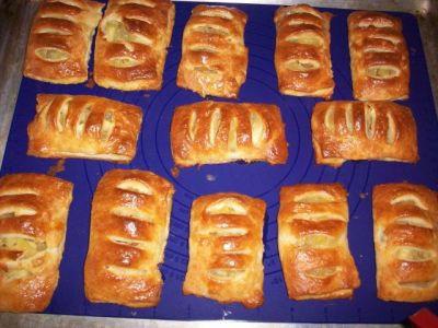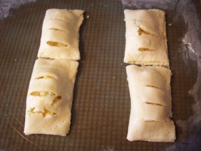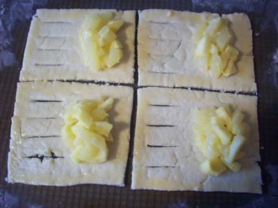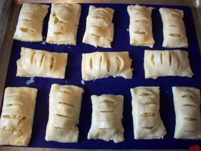 На одну половинку прямоугольника кладём столовую ложку яблок, а в другой половинке делаем несколько надрезов. Края теста смазываем разболтанным яйцом.