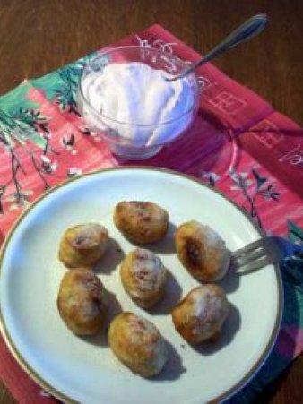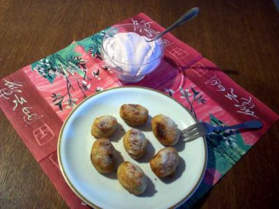 К таким пончикам хорошо подать йогурт. Я подала творожный крем