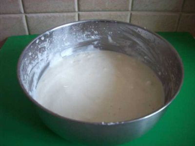 Аккуратно вмешиваем взбитый белок в тесто. Должен получиться довольно густой кляр.