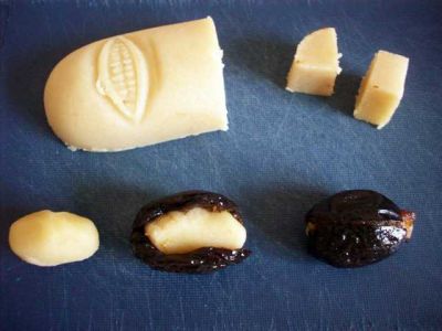 Вкладываем такую косточку на место настоящей и возвращаем сливе первоначальную форму. Делается это очень легко, т.к. и марципан, и мягкая слива хорошо поддаются лепке.