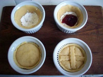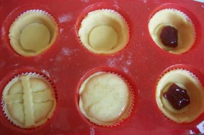 Теперь в каждую "укреплённую" корзинку кладём чайную ложку конфитюра и столовую ложку миндально-яичной массы. Корзиночка должна заполниться до краёв.
