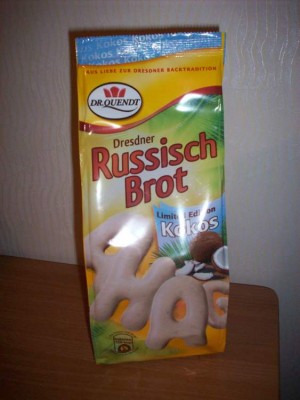 Печенье под названием "Русский хлеб" (Russisch Brot) продаётся в Германии во многих магазинах. Лёгкое вкусное печенье в виде букв латинского(!) алфавита.