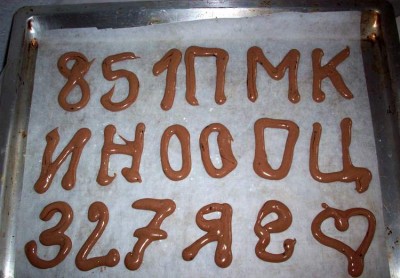 Теперь застилаем листик бумагой для выпечки и при помощи кондитерского шприца "рисуем" на листике буквы, цифры, сердечки. У меня роль кондитерского шприца играл полиэтиленовый пакетик с отрезанным уголком.