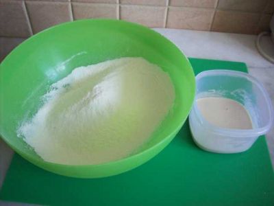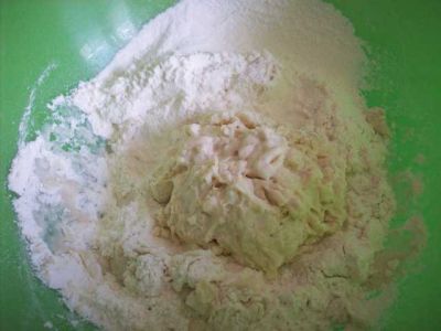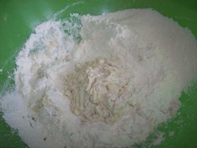 В середине муки делаем небольшое углубление и выливаем туда разведеные дрожжи. Подгребаем туда немного муки и перемешиваем её с дрожжами.