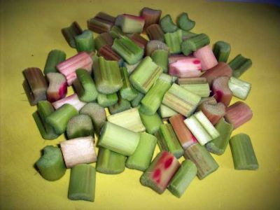 Помоем, почистим от кожуры и нарежем на кусочки длиной 2 см ревень.