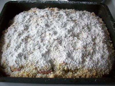 Горячий пирог обильно посыпаем сахарной пудрой.