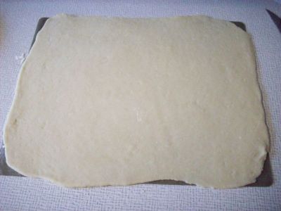 Раскатываем тесто на подсыпанной рабочей поверхности, а еще лучше прямо на листике, на котором будем его выпекать, т.к. тесто мягкое и перекладывать его не очень удобно. Я раскатывала на столе, но на силиконовой подстилочке, которую потом вместе с тестом перенесла на противень.