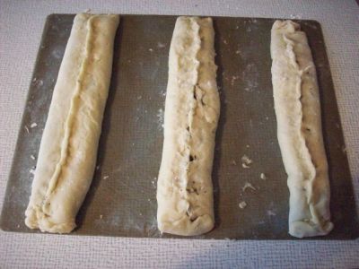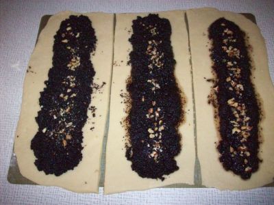 Раскладываем начинку. У меня оставалось от предыдущей выпечки немного орехов и я их тоже выложила на начинку.