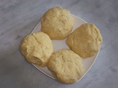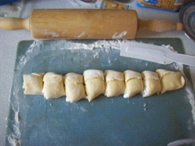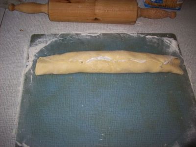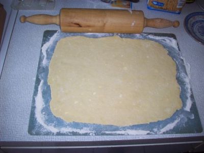 Достать из холодильника одну часть теста и раскатать её довольно тонко.